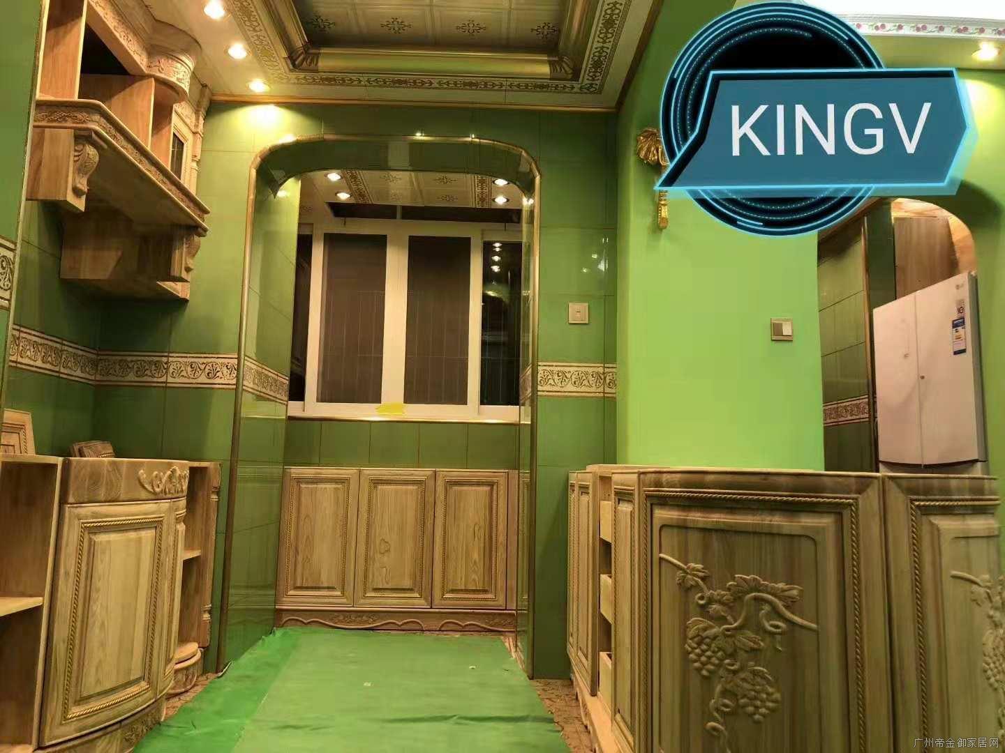 廚房另一側(cè)為一字型,吊柜設(shè)計為雙開門掩門式,吊柜雕花的設(shè)計是按照天花的花紋精心挑選出來,再加上門板設(shè)計成金色藤蔓式方框顯得雕花更具獨一且奢華,右側(cè)柜子中間安置層板一些常放物可放入其中整齊而不雜亂。