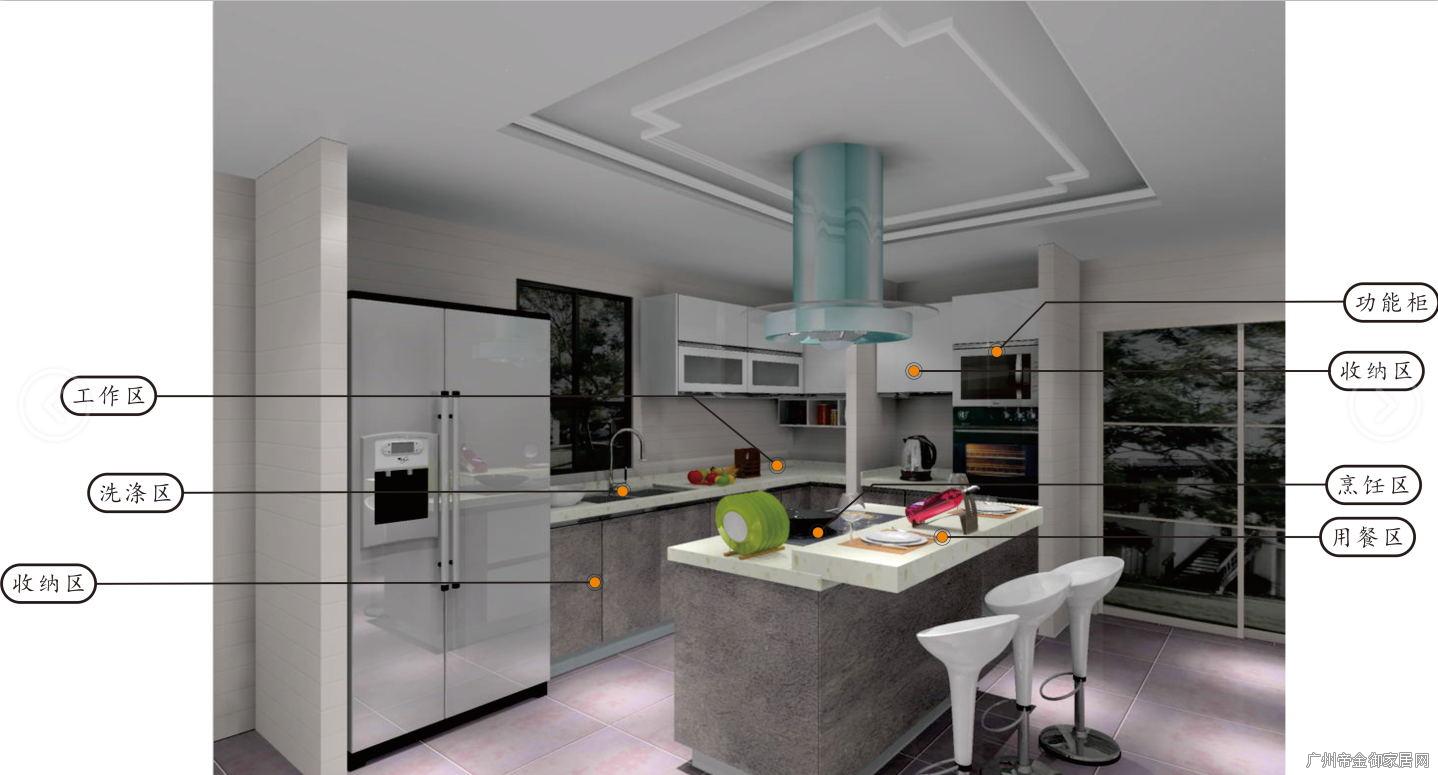 廚房空間較小,為了保持工作臺的長度便將工作臺延伸至L型。櫥柜計價方式是按米算, 將冰箱嵌入廚房減少櫥柜長度米數(shù)。將冰箱嵌入廚房不僅方便許多,而且由于冰箱的嵌入從而在價格性價比方面得到提升。吊柜下方安置開放式小柜格可放置常喝的茶類等物品。櫥柜中間安置中島,由于廚房空間較小,設(shè)計師將烹飪區(qū)置入中島,由于用餐區(qū)得在廚房進行,中島又被爐頭霸占,設(shè)計師便將中島邊緣上方安置石英石從而實現(xiàn)延伸,即可在中島進行烹飪還能進行用餐,便無需將菜品左右端至其他區(qū)域。實現(xiàn)安全與便捷。