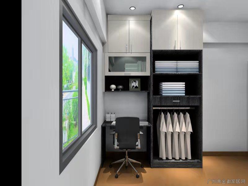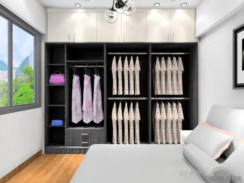 衣柜主要以掛衣服為主,左邊層板放置疊衣服,上邊平開門可放置棉被或行李箱整個空間收納模式較為優秀、簡單、實用。顏色搭配選擇了黑色+木紋給人感覺較為安靜睡眠方面更為舒暢。