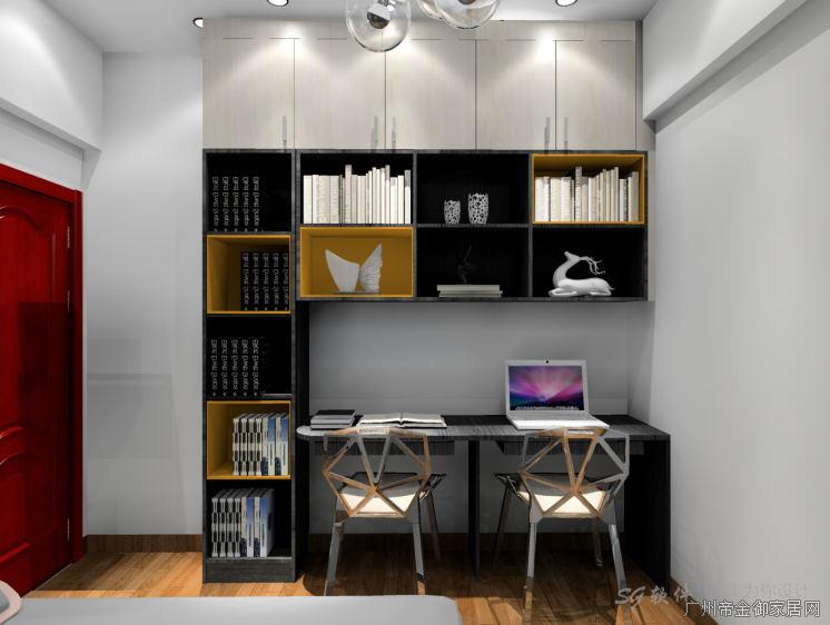 主人房對面空間則制作書柜,閑暇時間看看書或辦公都可在房間進行,書桌長度為1.5米正好適合兩人座位,層板間隔高度為A4紙大小,放置大小書籍完全沒問題,顏色的搭配選擇與衣柜相同的黑色會顯得空間色澤比較為統一,層板間隔加入了橙色元素,不會顯得空間顏色感過于單調,上方柜子直接做到頂空間收納與美感更為優秀!